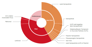 - The dominant viral delivery approach is Lentiviral, while Lipid Nanoparticles lead the way for non viral delivery methods.