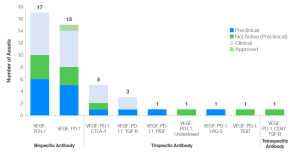 - Trispecific antibodies are less common, VEGF;PDL-1;CTLA-4 and VEGF;PDL-1;TGFB having 5 and 4 assets, respectively